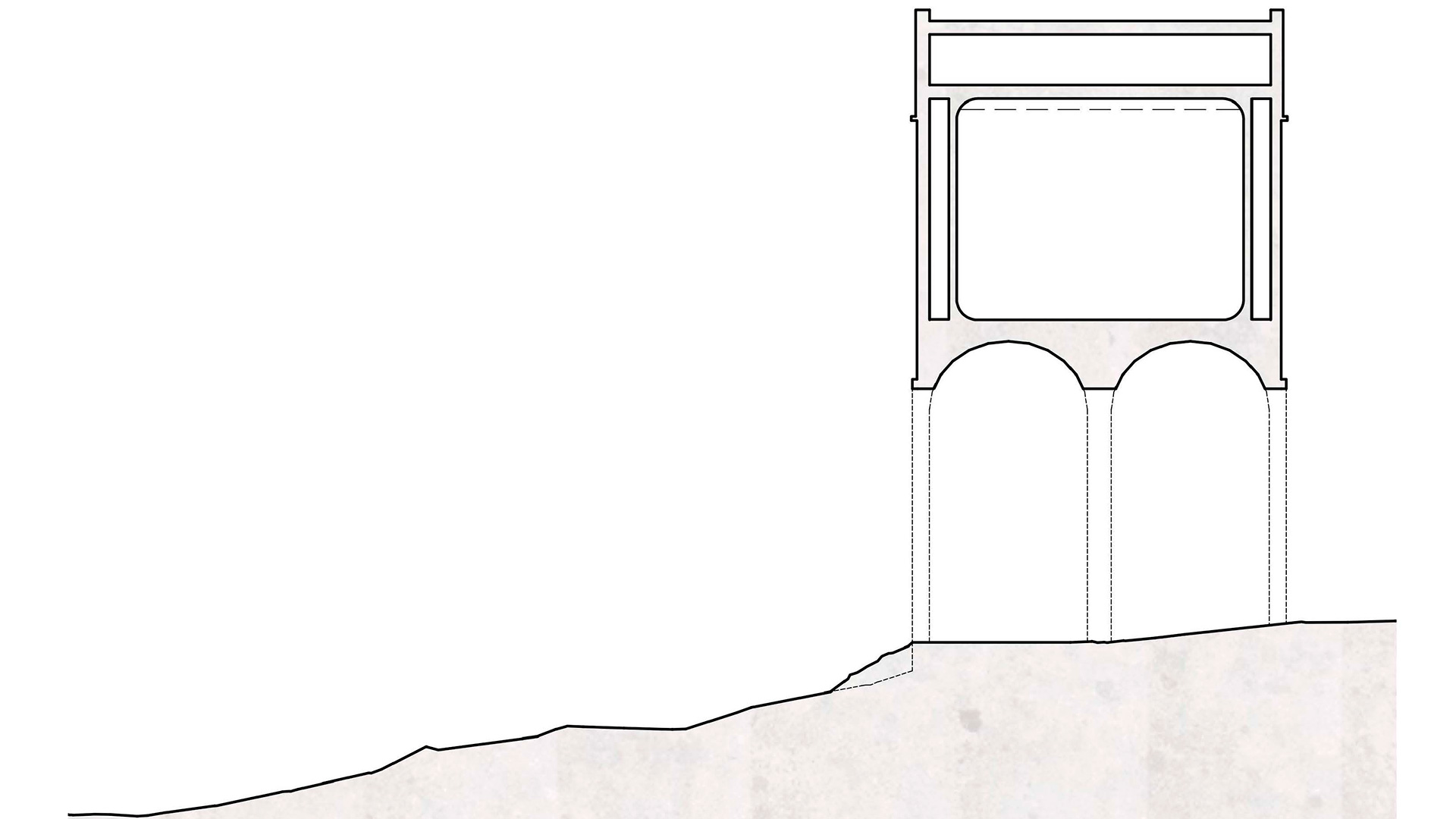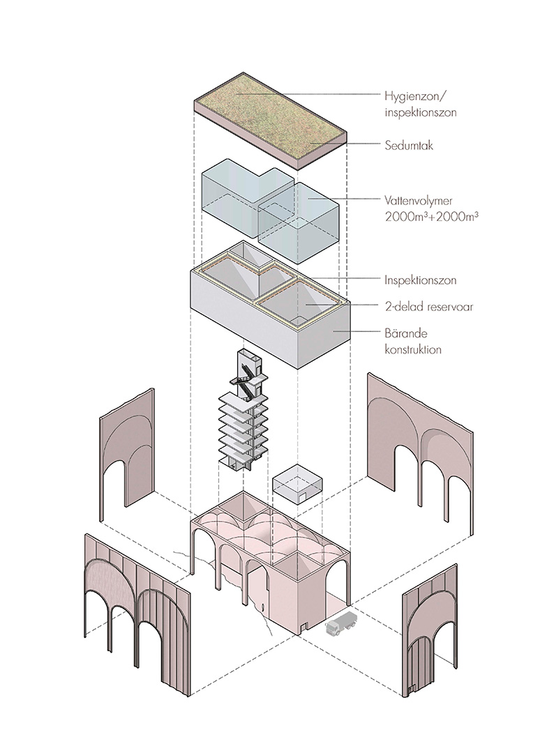 För att minimera inverkan i naturen är det endast under de två benen som det finns en pågjuten bottenplatta. Mellan pelarna får de vackra berghällarna råda. I och med platsens höga naturvärden anläggs det heller inga nya gångvägar utan besökaren leds upp av sin egen nyfikenhet endast lätt guidad av arkitektoniska element, omsorgsfullt placerade längs med platsens naturliga stråk, som utformas för att materiellt och formmässigt hänga ihop med vattentornet.