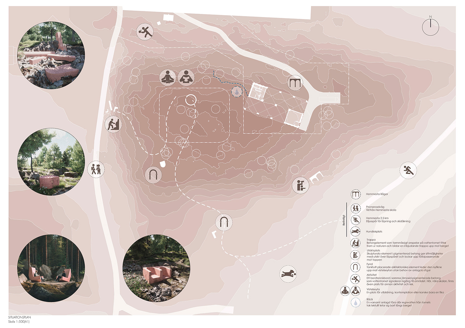 Väl uppe på toppen möts man av vattentornet och den vackra hällmarken. Landskapet kompletteras av en ensam ring av rödpigmenterad betong där kan man sitta och uppleva naturen och arkitekturen både som ensam vandrare eller som del av en skolutflykt.