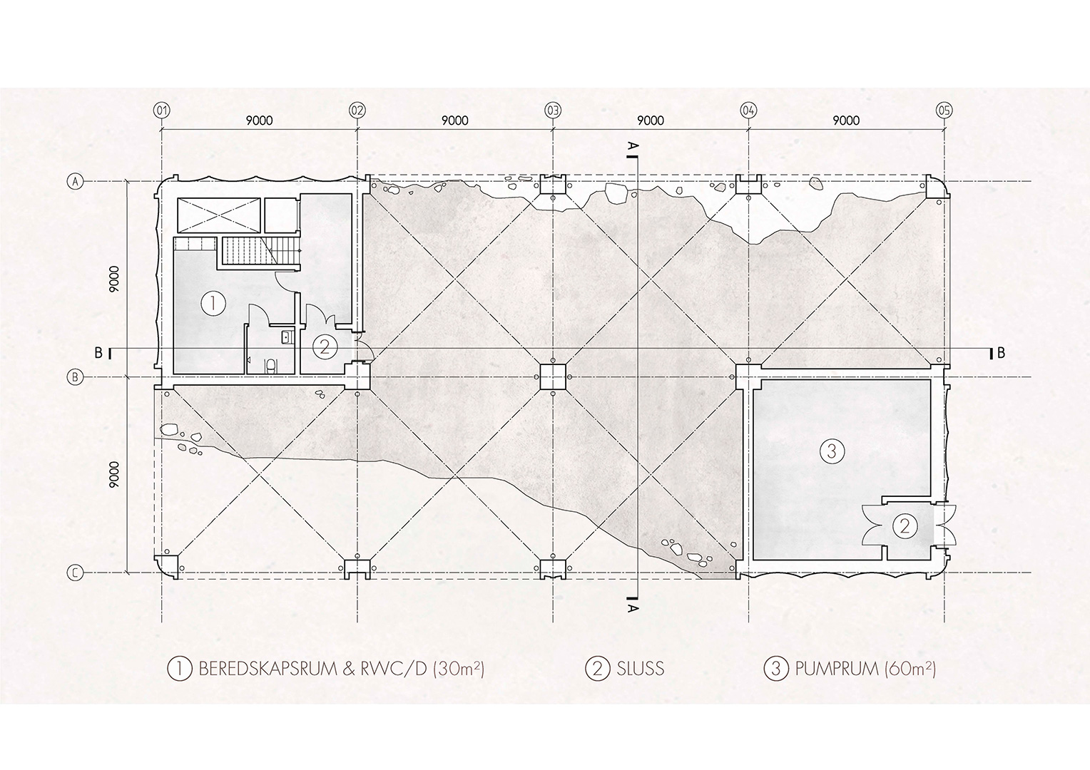 Byggnaden utförs i rödpigmenterad betong som ger ett mjukt intryck och harmonierar med berget och naturen under årstidernas skiftningar. Den röda kulören återfinns i närområdets skärgårdsmiljöer och många befintliga byggnader, från skolan i Hemmesta till industribyggnaderna på Gustavsbergs porslinsfabrik.